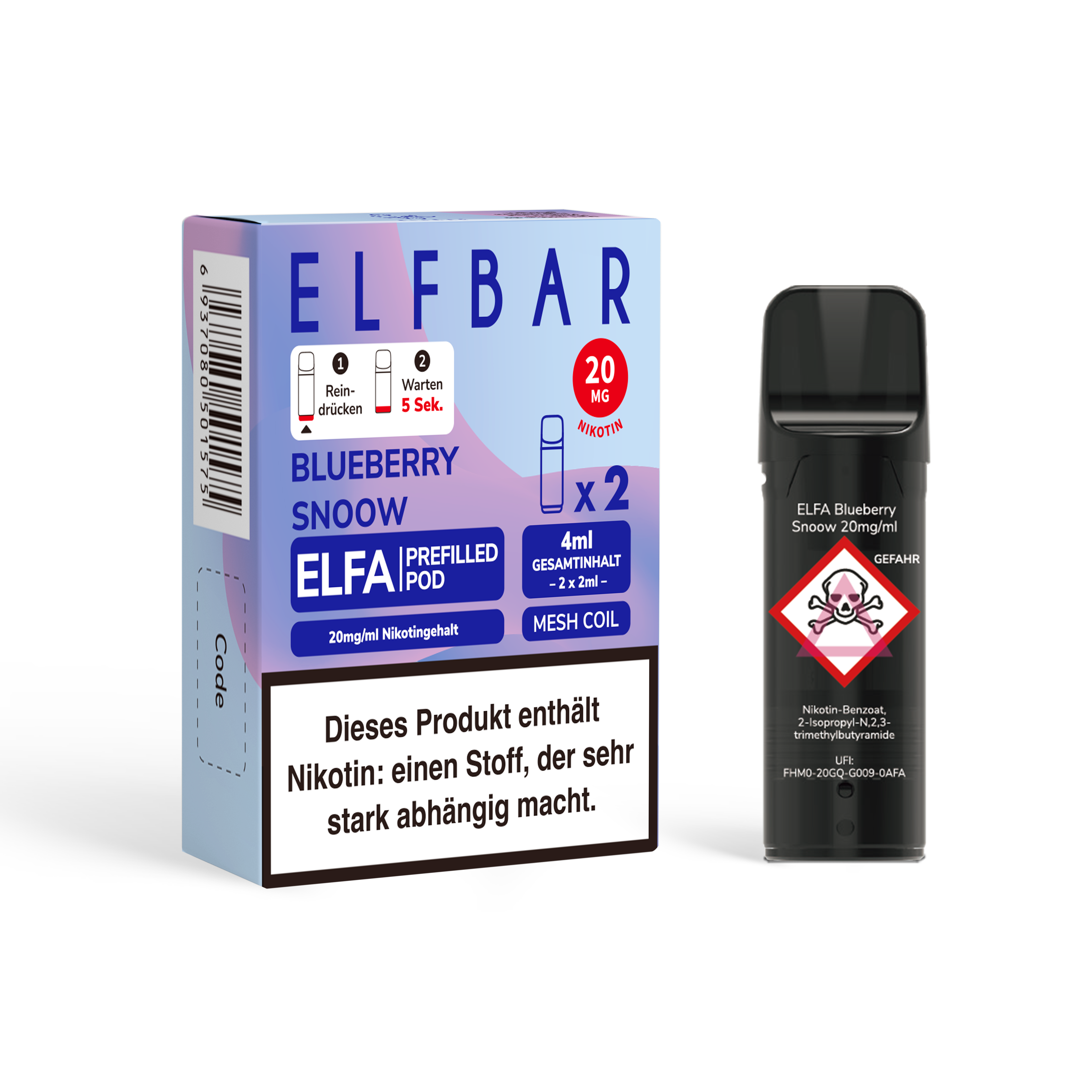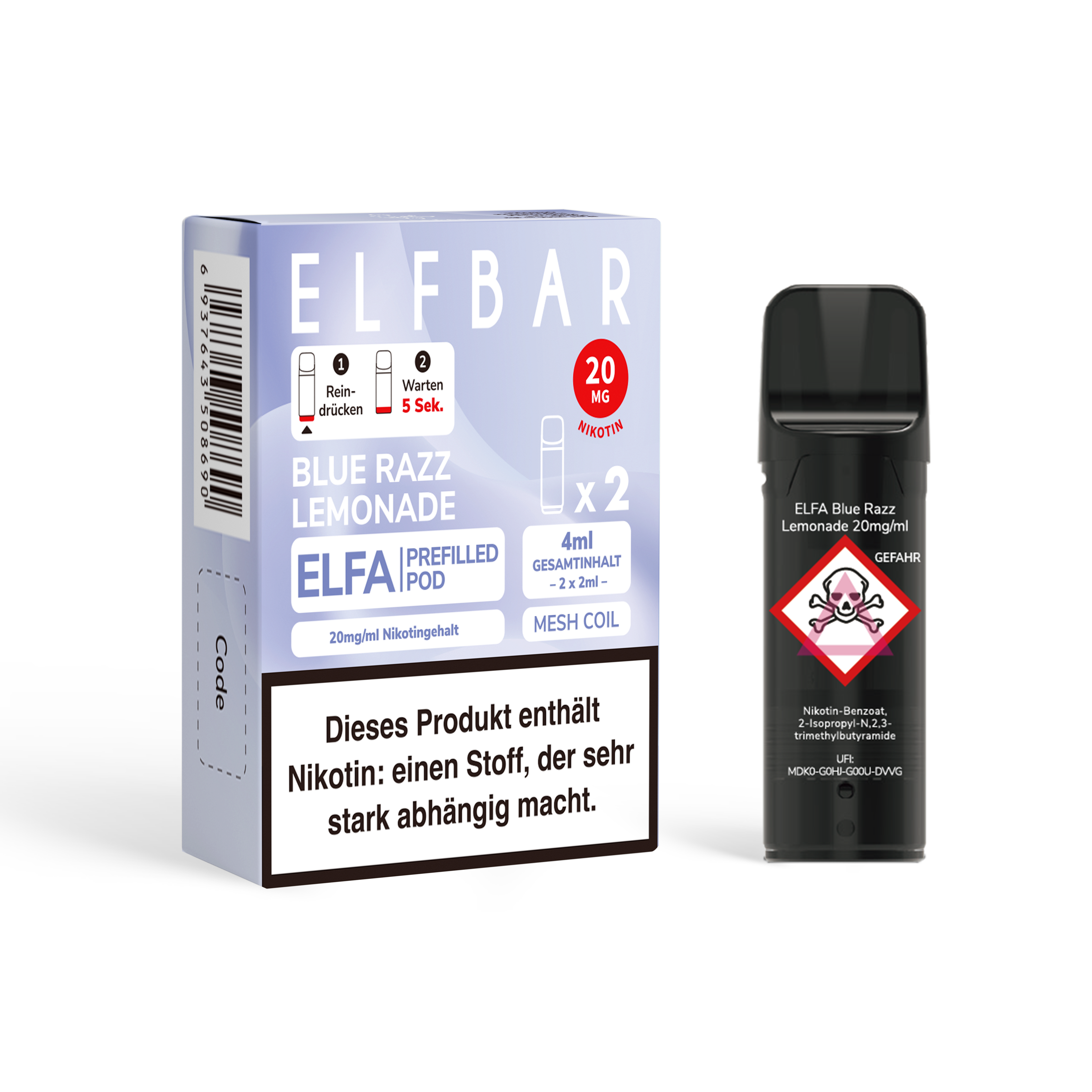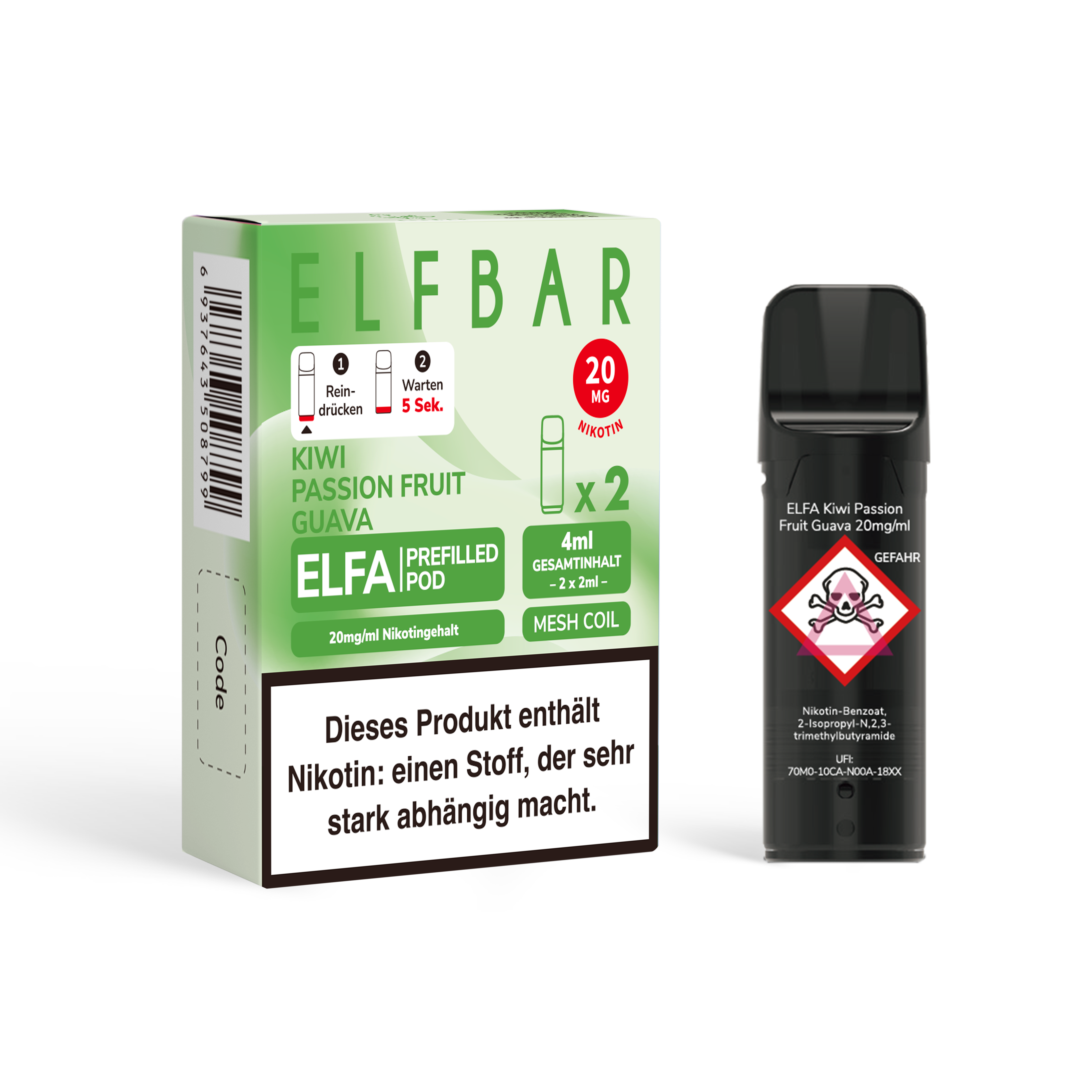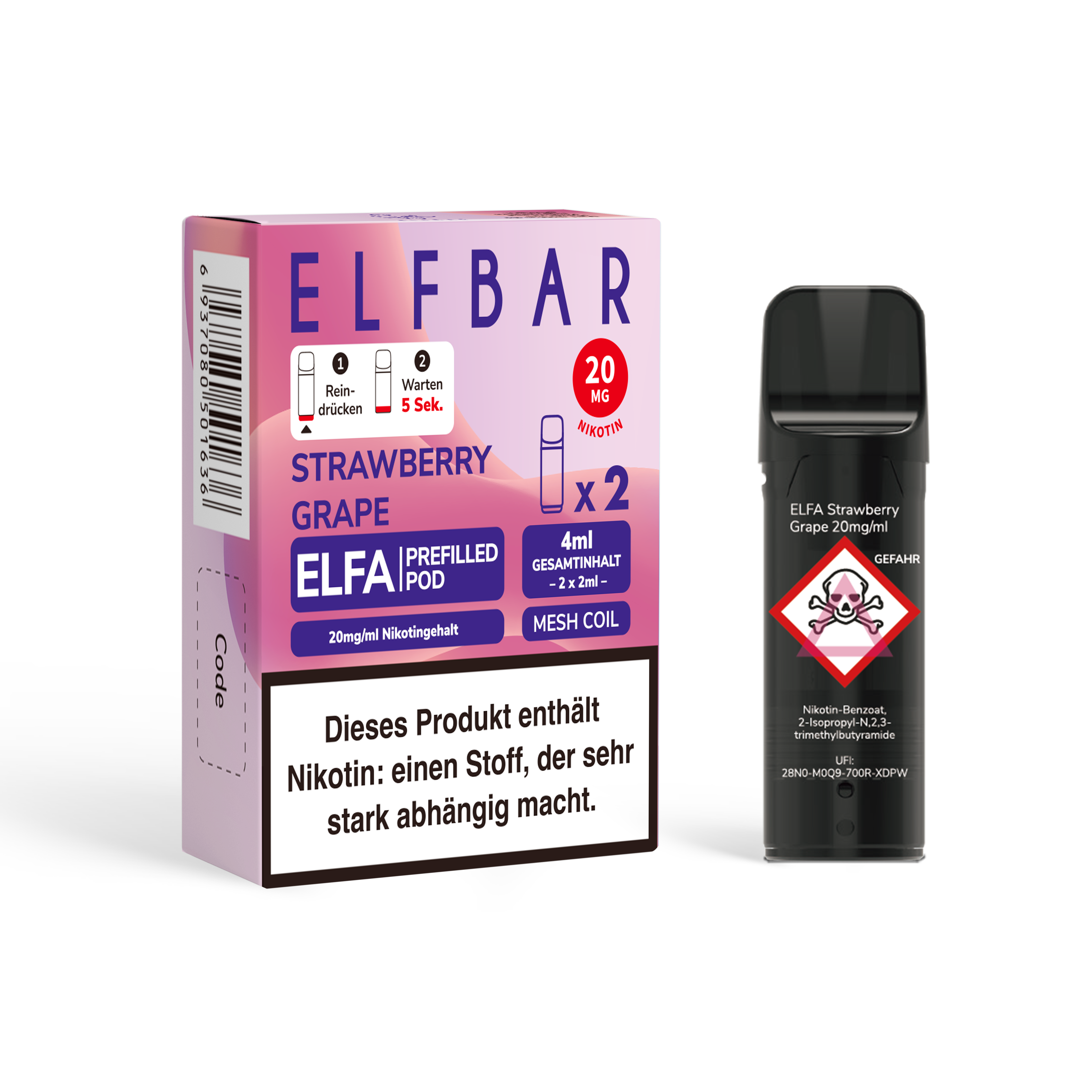 - Nikotinstärken: 20 mg/ml Nikotinsalz und 0 mg/ml (nikotinfrei)