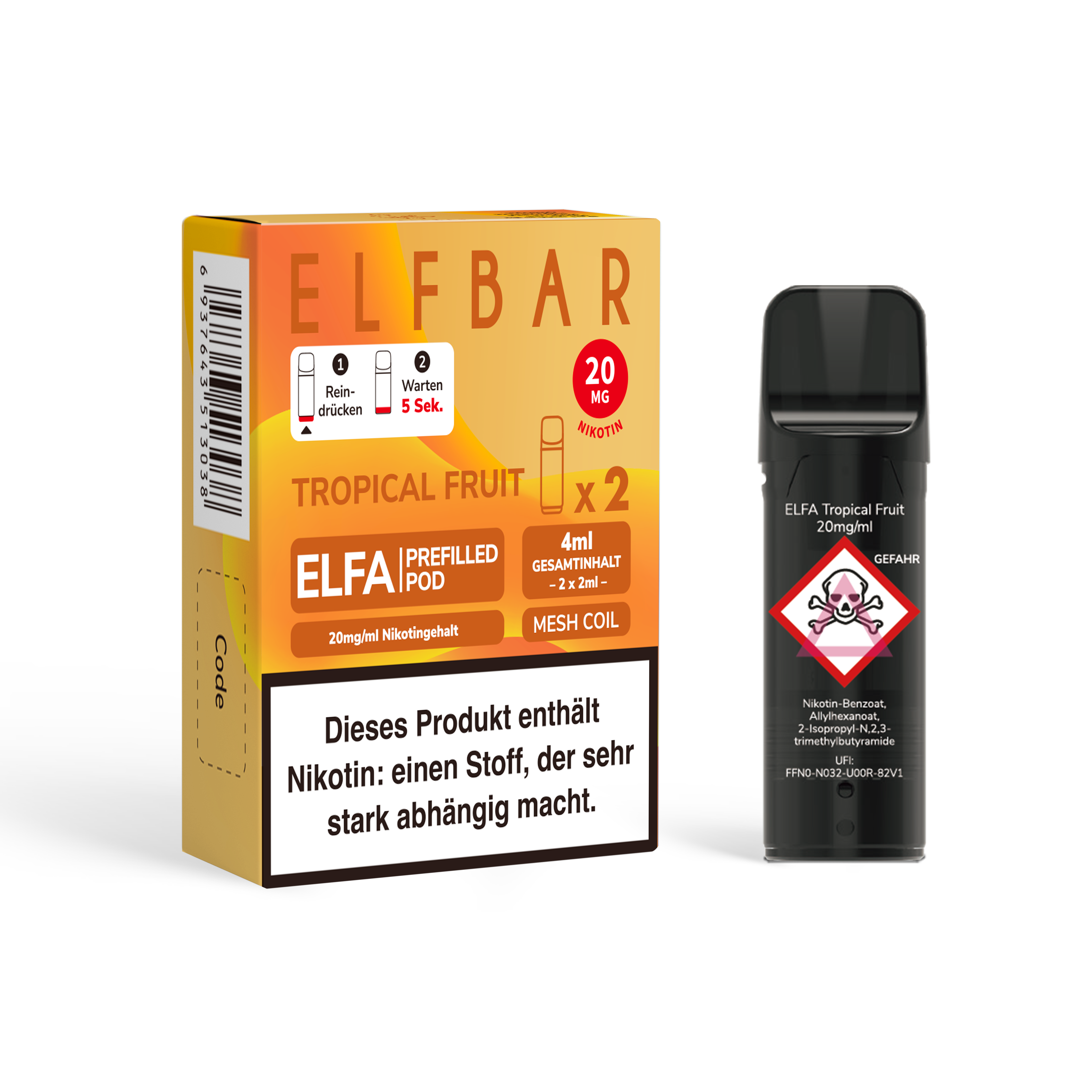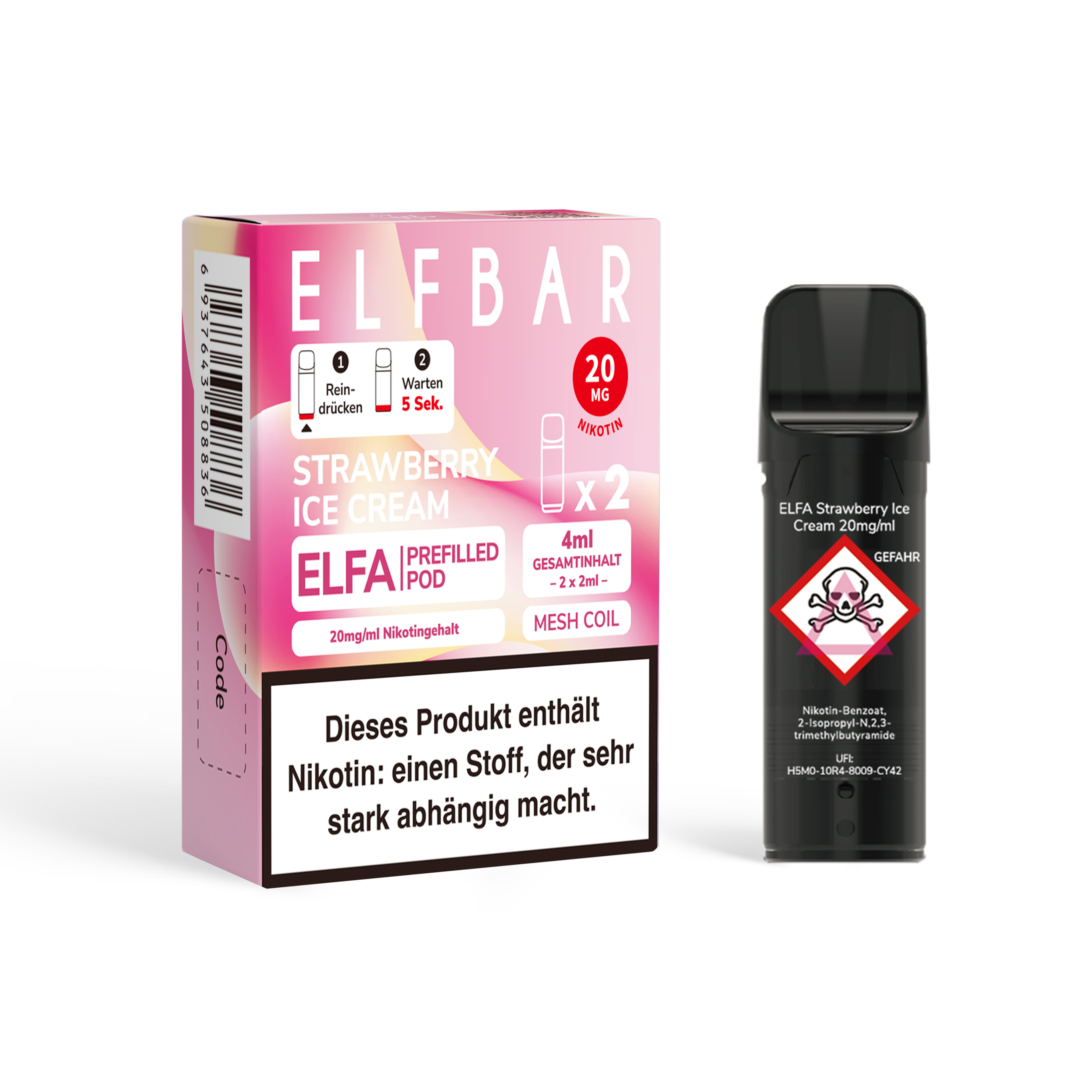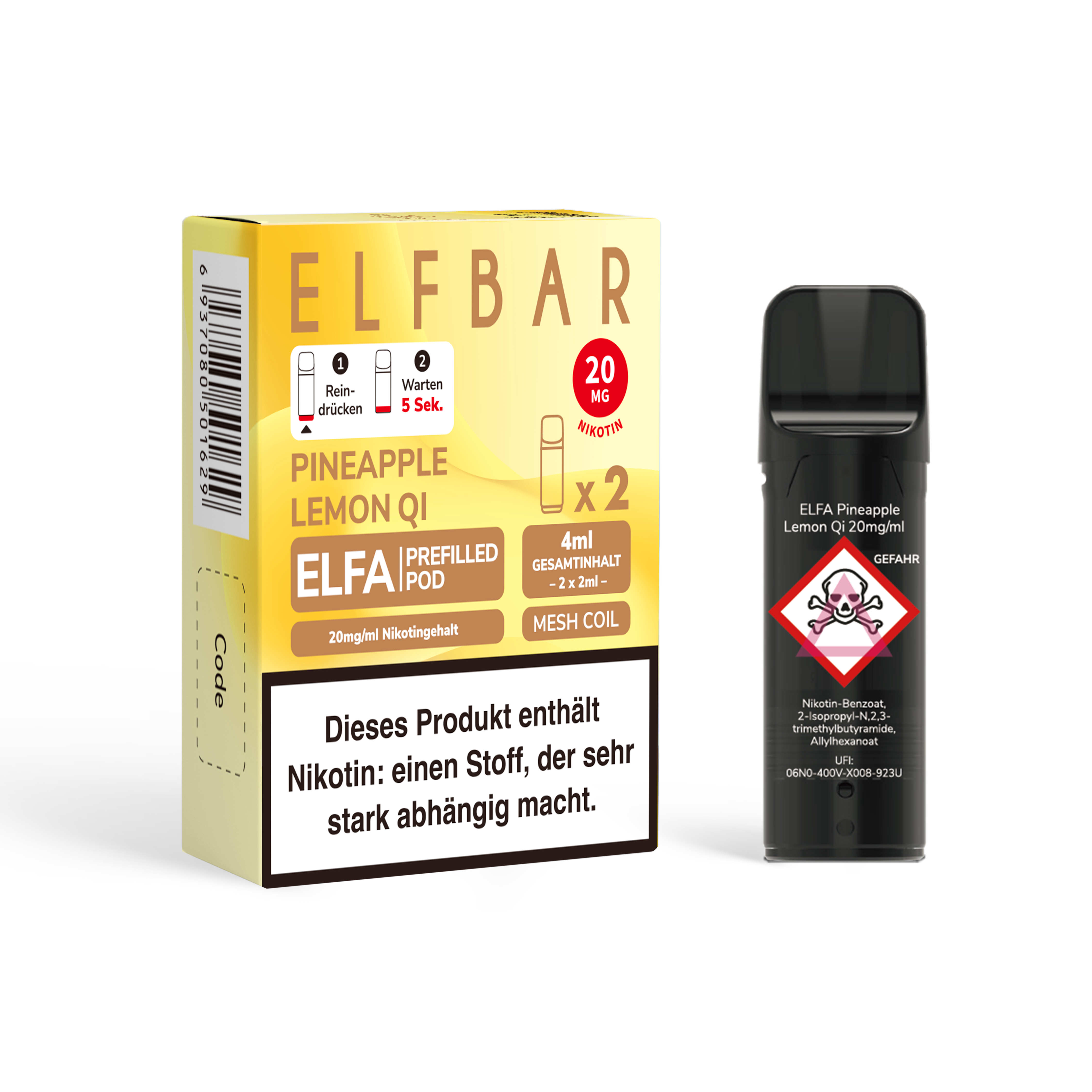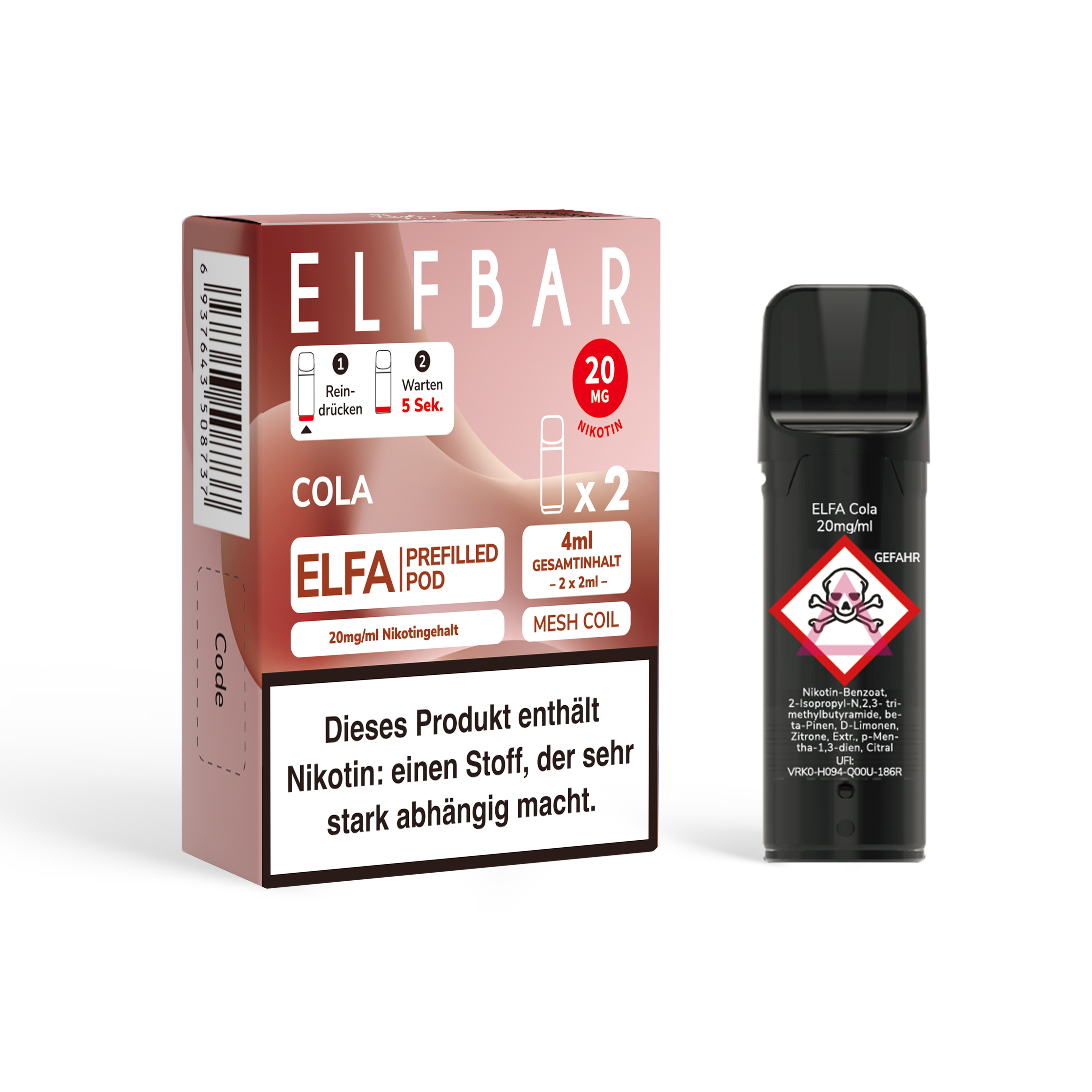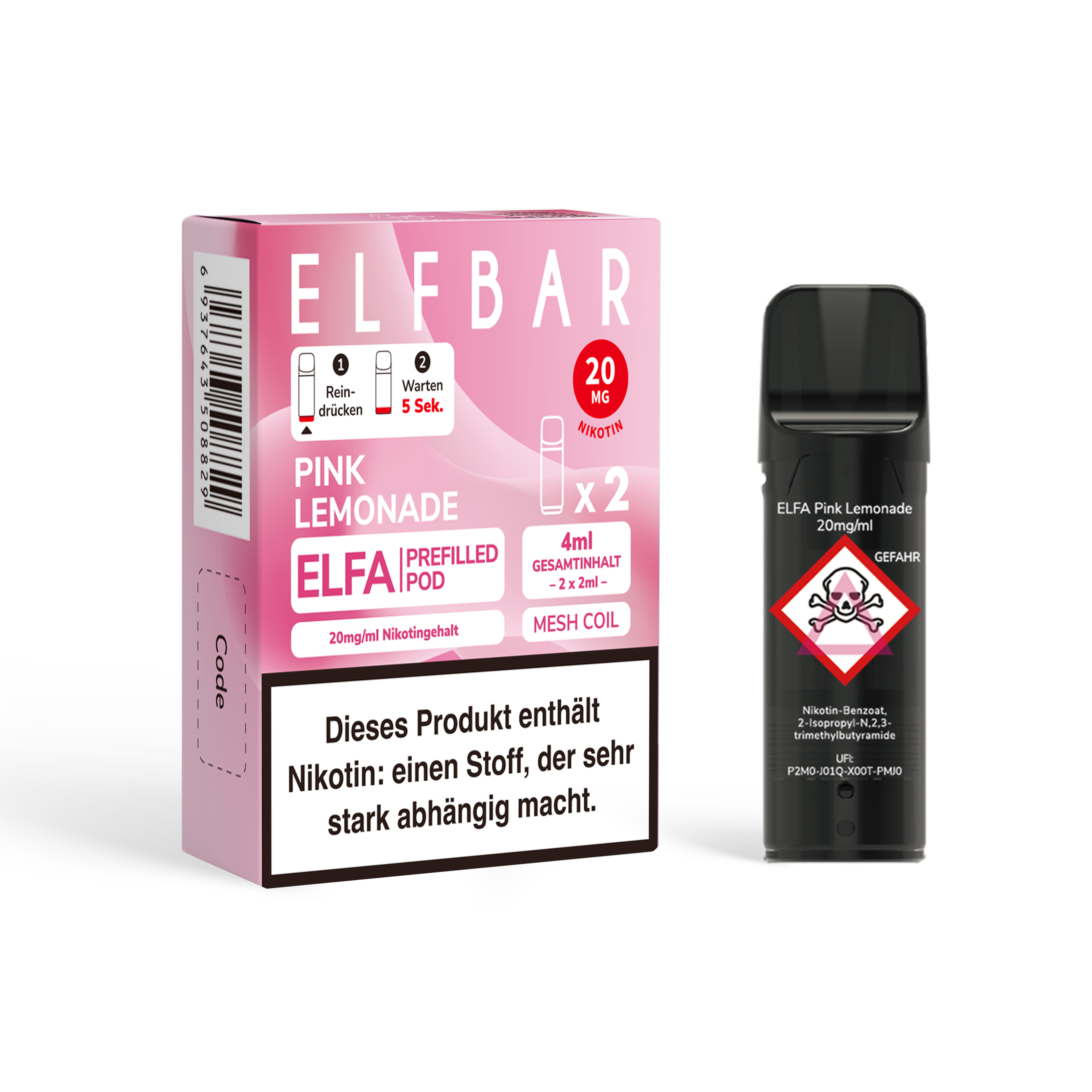 - Nikotinstärken: 20 mg/ml Nikotinsalz und 0 mg/ml (nikotinfrei)